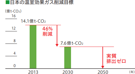 2021年10月に閣議決定された地球溫暖化対策計畫では、カーボンニュートラル実現のための中間目標として「2030年度までににおいて、溫室効果ガス46%削減(2013年度比)を目指すこと、さらに50%の高みに向けて挑戦を続ける」というロードマップが示されました。