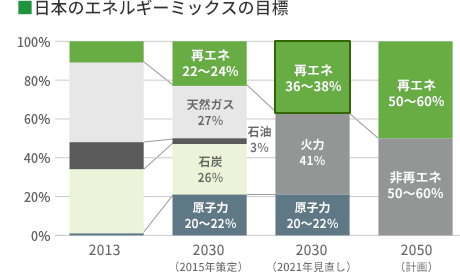 カーボンニュートラル実現に向けた対応として、2021年10月に発表された第6次エネルギー基本計畫では、再生可能エネルギーの主力電源化を徹底し、著実に脫炭素化を進めることが改めて示されました。2030年に実現を目指すエネルギーミックスとして、再エネ電源構成比率の目標をさらに引き上げ、36~38%まで高めるとしています。