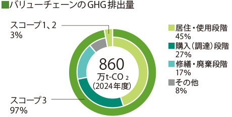 住宅?建築物の特徴は、その使用期間の長さです。日本の住宅の平均壽命は一般的に30年と言われており、そのライフサイクルにおいては「居住?使用段階」のGHG排出が最も多くなります。大和ハウスグループにおいても、バリューチェーン全體のGHG排出量のうち、居住?使用段階における排出が占める割合は約45%にのぼります。そのため、総排出量の削減に向けては、高い斷熱性能や省エネ機器を採用することによって、できるだけ使うエネルギーを減らす建物を建てることが重要です。