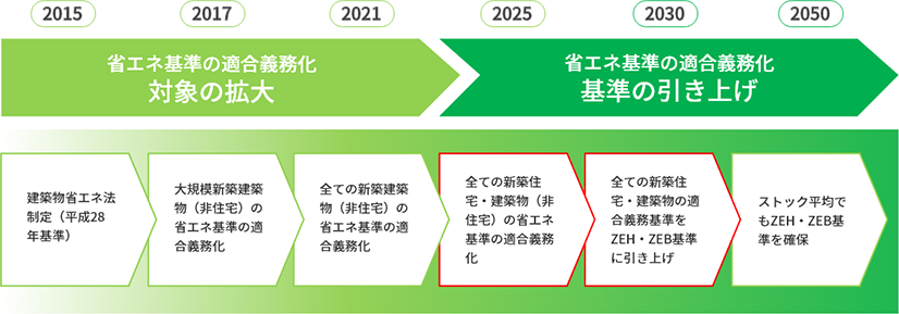 2015年に建築物省エネ法が制定されて以降、建物の用途や規模に応じて、順次、國が定める省エネ基準への適合義務化が進められてきました。2025年4月にはすべての新築建物(住宅?建築物)に対する適合義務化が開始。今後も、段階的に基準の引き上げを進めることで、2030年にはすべての新築建物がZEH?ZEBレベルの省エネ性能を確保していることが目標として掲げられています。