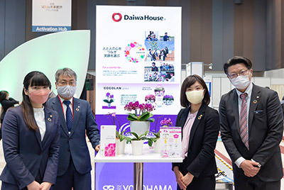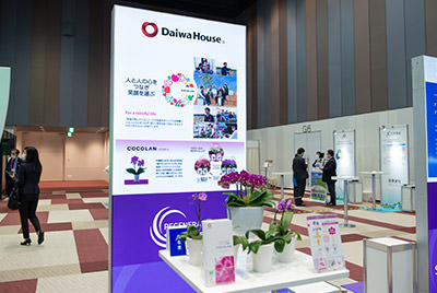 登壇者の前に飾られた花は、大和ハウス工業が栽培するミニ胡蝶蘭「COCOLAN(ココラン)」です。この花が誕生するまでの背景と、栽培を通じて高齢の方や障がいのある方など、さまざまなステークホルダーと「E」でつながる取り組みについて、上席執行役員の原納から報告しました。