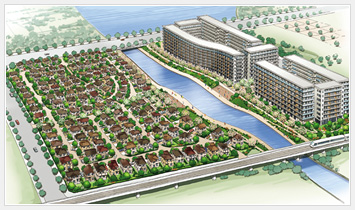 『越谷レイクタウン』內に戸建住宅(132戸)と分譲マンション(500戸)を一體開発。風?太陽?水といった自然を最大限活かす工夫を施し、街區全體でCO2排出量の20%以上の削減を目指しています。