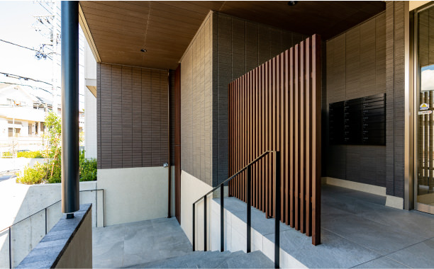 クランクを設けることで勾配をなだらかにしたエントランスの階段。幅広い年齢層が長く安全に暮らせるよう工夫しています。
