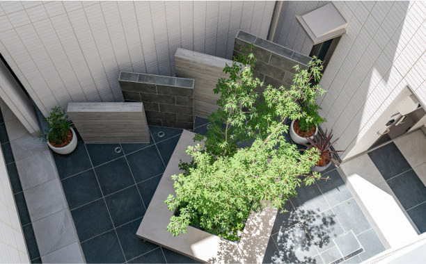 Aさまのご要望にお応えし、立地としての課題も解決するべくこだわったのは外観だけではありません。最大の特徴である2つの中庭を中心に、敷地內や各部屋に散りばめられたこだわりをご紹介します。