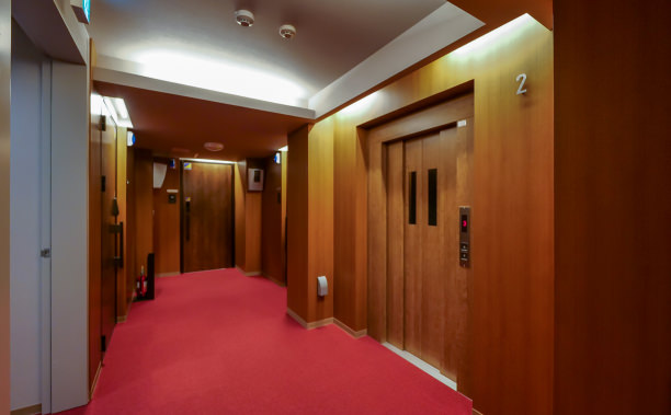 2?3階はホテルのような空間をイメージし、赤色のタイルカーペット材を使用しています。