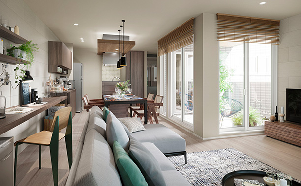 バルコニーと繋がる開放的なリビングやワークスペースなど、ご入居者の想いに応える多様な暮らし方をご提案。