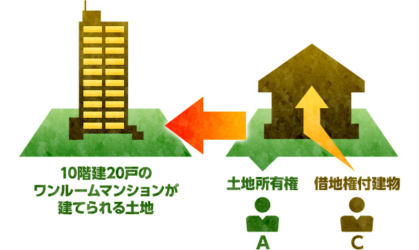 都市部の一等地であれば、土地建物が合わさった完全所有権となれば、この土地の価値(例えば、10階建て20戸のワンルームマンションが建設可能)は飛躍的に増大することになりますが、AもCもお互いに譲れません。