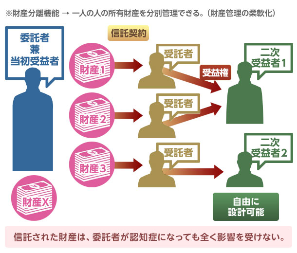 家族信託の「財産分離機能」とは、當初の所有者が、自分の意思で財産を自由に切り分けて、信託するも良し、しないも良し、また信託する財産についても財産それぞれによって別のルートを作ることが自由にできるという機能です。