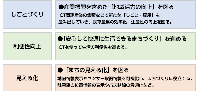 「利便性向上」では、母子健康手帳の電子化やオンライン診療、遠隔健康相談などICTの活用が目立ちます。「見える化」では除雪車にGPS端末を搭載して除雪車の稼働狀況を知らせます。またスマートフォンやパソコンで路線バスの時刻や乗り継ぎ、運賃の検索などもできるようにしました。