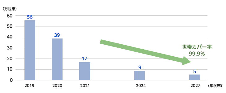 光ファイバは、居住者向けでは2020年度末時點で未整備の世帯が39萬で、世帯カバー率は99.3%。これを2027年度末に99.9%(未整備世帯は5%)まで低減させる計畫です。また2023年度末までに、光ファイバおよび攜帯電話のいずれも使えない地域を解消させる計畫です。攜帯電話4事業者にける「不感地帯」は、2021年度末で40集落、519人になっています。