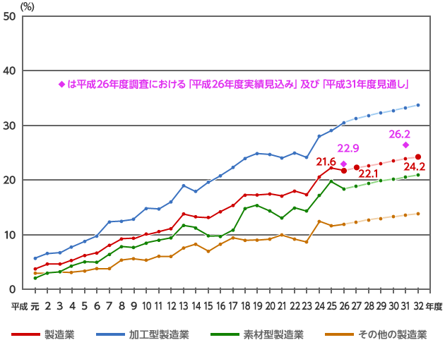 內閣府から平成28年2月26日に発表された、「平成27年度企業行動に関するアンケート調査結果」によると、海外現地生産比率の「平成26年度実績」は21.6%と、前年度実績(22.3%)に比べて低下しました。「平成27年度実績見込み」では22.1%、「平成32年度見通し」では24.2%と、上昇する見通しとなっていますが、前年度調査における見通しを下回る結果となりました。