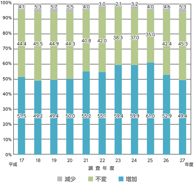 注)増加:「見通し」-「実績見込み」>0、不変:「見通し」-「実績見込み」=0、減少:「見通し」-「実績見込み」<0、(例えば、平成27年度では、回答企業毎に「平成32年度見通し」から「平成27年度実績見込み」を引いた値が、プラスの場合は増加、同じ場合は不変、マイナスの場合は減少)。