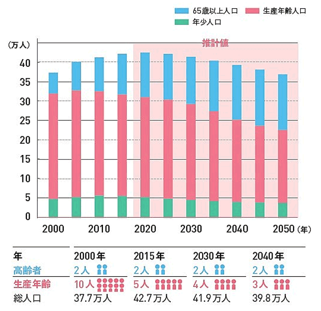 コンパクトシティが注目されるようになった背景には、大都市圏における高齢化の進展が急速に進んでいることがあります。國土交通省が2015年に発表した資料「コンパクトシティの形成に向けて」によると、東京圏における高齢者人口(85歳以上)は2010年の段階で79萬人ですが、2040年には270萬人と240%の増加率を予測しています。名古屋圏、関西圏も同様の予測が出ています。町田市では、2000年は高齢者2人を生産年齢10人で支えていましたが、2040年には高齢者2人を生産年齢3人で支える狀況になると予測しています。