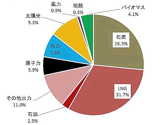 特定非営利活動(dòng)法人「環(huán)境エネルギー研究所」によると、國(guó)內(nèi)の2021年の電源構(gòu)成(電力を作るエネルギーの種類(lèi)で分類(lèi)した発電設(shè)備の割合)は火力発電が7割以上を占めています(石炭26.5%+LNG(液化天然ガス)31.7%+石油2.5%+その他火力11.0%=71.7%)。火力発電は化石燃料を燃焼する際に溫室効果ガスを排出し、地球溫暖化に影響を與えているとされています。一方、原子力や再生エネルギーの電源は3割に屆いていません(原子力5.9%+水力7.8%+太陽(yáng)光9.3%+風(fēng)力0.9%+地?zé)?.3%+バイオマス4.1%=28.3%)。
