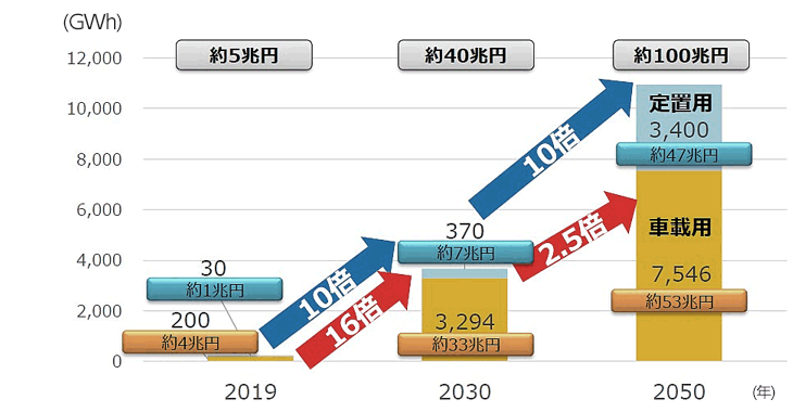 2050年までのカーボンニュートラル実現(xiàn)を目指す國(guó)もこうした動(dòng)きに呼応し、昨年10年ぶりに蓄電池産業(yè)戦略の中間報(bào)告書(shū)をとりまとめました。蓄電池の世界市場(chǎng)は車(chē)載用がけん引していくと思われ、EV市場(chǎng)の拡大で2030年には約33兆円。2050年には約53兆円規(guī)模になりますが、家庭や企業(yè)などでの定置用蓄電池市場(chǎng)も2050年には約47兆円と肉薄するとの予測(cè)を立てています。