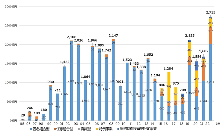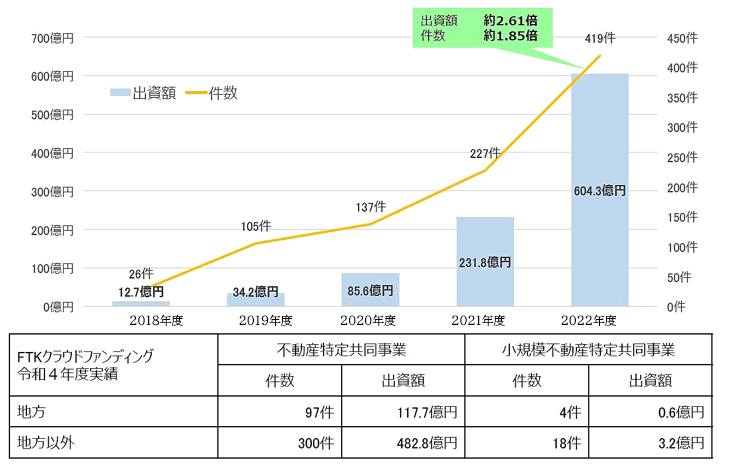 國土交通省は2021年7月に「不動産特定共同事業(yè)(FTK)の利活用促進(jìn)ハンドブック」を作成し、FTKの利活用について調(diào)査や啓発を進(jìn)めてきました。今年7月に改訂版を公表しています。それによると、FTKに対する出資募集額は2022年度に2,715億円と、FTK法が制定された1995年(29億円)と比べて大幅に増加しています。また、クラウドファンディングによる出資募集額も2022年度に419件/604.3億円で、5年前と比較すると件數(shù)で約16倍、金額で約48倍と大幅に増えています。