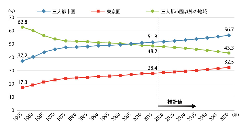 地方はさらに深刻です。大都市と地方の差はさらに広がるとも予測されています。東京圏、三大都市圏、それ以外を比較すると、人口差はますます広がると予測されています。