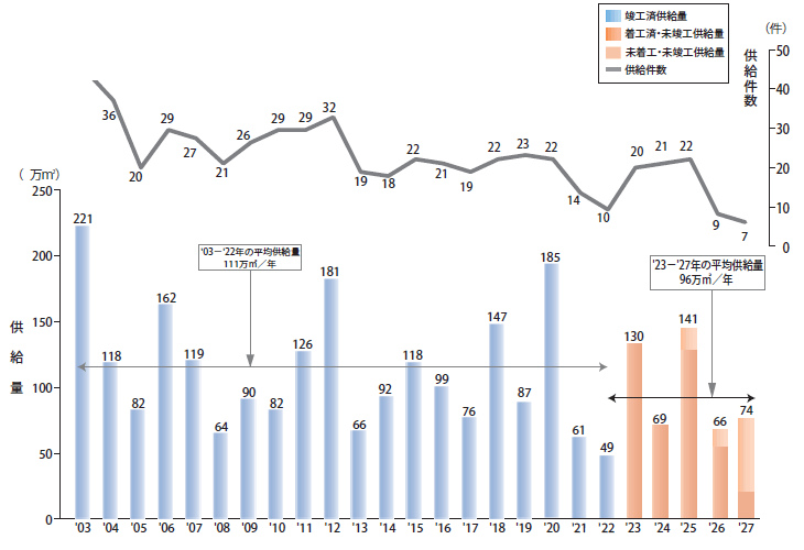 森トラストが2023年6月に公開した「東京23區のオフィスビル供給量調査」(2022年12月時點調査)によると、2022年の大規模オフィスビルの供給量は49萬m2に留まり、過去20年で最も少ない供給量を2年連続で更新。2023年は130萬m2、2025年は141萬m2と一定規模の供給になる一方で、2024年は69萬m2、2026年は66萬m2、2027年は74萬m2と供給は絞られる、と予測しています。ただし、2003年からの推移を見ると、供給量は需給バランスの関係で3年前後の間隔で上下動を繰り返しており、今後の推移も過去と比較すれば、必ずしも大きな変化といえないかもしれません。