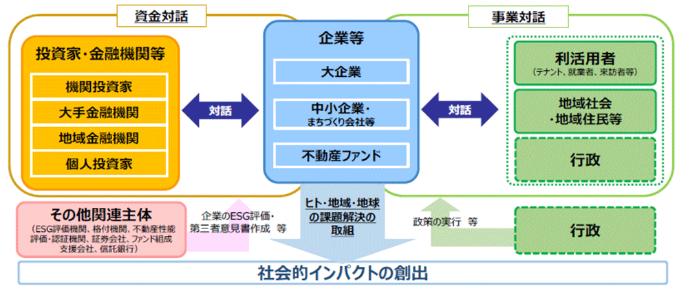 社會的インパクト不動産を普及させるには、企業と投資家および金融機関、企業と利用者?地域社會という構図の中で「対話」が生まれるべきである、と國交省の「不動産分野の社會的課題に対応するESG投資促進検討會」は指摘しています。不動産の価値を高めるには相応の資金が必要です。資金を出す側は、ESGの貢獻度が高い不動産への投融資は自らの評価も高めることから、資金の使い方を巡って不動産の開発主體との間で意見交換することが欠かせません(資金対話)。