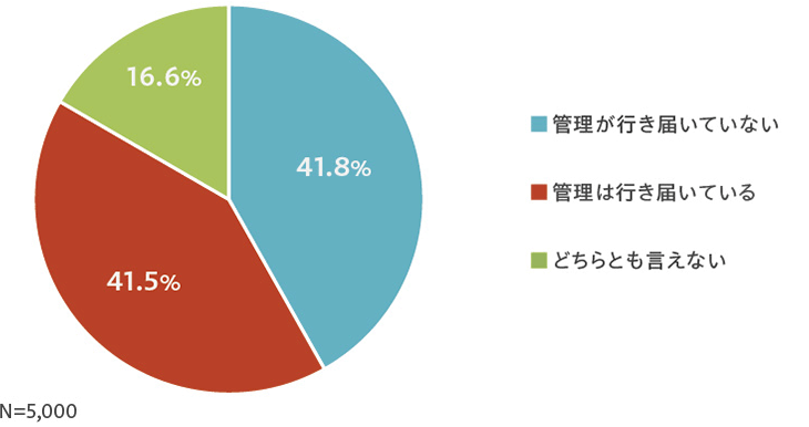 日常的に利用されていない土地の所有者(當該土地所有者の家族及び今後相続で所有する予定の者を含む)に対して、土地の管理狀況を聞いたところ、「管理が行き屆いていない」が41.8%、「管理は行き屆いている」が41.5%、「どちらとも言えない」が16.6%となっています。この結果だけを見ても、管理が行き屆いていないと考える人が約半數にのぼることがわかります。以前のデータとの比較はありませんが、管理不行き屆きは増加傾向にあると思われます。
