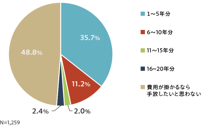 「日常的に利用されていない土地を今後も保有し続けたいと考えるか」という質問に対して「売れる見込みはないが、手放せるものなら手放したい」と回答した人を対象に、「一定の管理費を負擔する代わりに土地を手放せるとしたら、おおよそ何年分の管理費用までなら負擔できるか」を聞いたところ、「1~5年分」が35.7%、「6~10年分」が11.2%、「11~15年分」が2.0%、「16~20年分」が2.4%、「費用が掛かるなら手放したいと思わない」が48.8%となっており、費用を掛けても土地を手放したいと考えている人は半數を超えているとはいえ、その多くは「1~5年分」と回答。また、費用が掛かるなら手放したいと思わない人も約半數おり、費用面の問題が、利用されない空き家や空き地を増加させている大きな問題のひとつになっているようです。