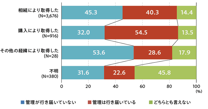 土地の取得経緯は、多くが相続で約73.5%、購入が約18.3%と、この二つが大半ですが、土地の取得経緯別に日常的に利用されていない土地の管理狀況を聞いたところ、「相続により取得した」場合には、「管理が行き屆いていない」が45.3%、「管理は行き屆いている」が40.3%、「購入により取得した」場合には、「管理が行き屆いていない」が32.0%、「管理は行き屆いている」が54.5%となっています。