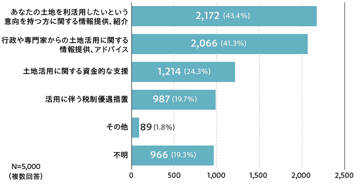 さらに、土地の利活用を考える際に必要な措置(複數回答)を聞いたところ、「あなたの土地を利活用したいという意向を持つ方に関する情報提供、紹介」が43.4%、「行政や専門家からの土地活用に関する情報提供、アドバイス」が41.3%となっており、土地の利活用のための情報不足が大きな要因となっているようです。