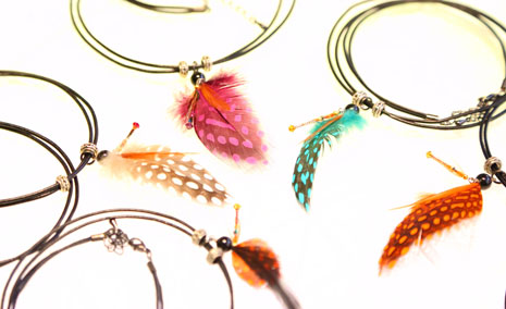 明治に入り、鮎釣りが庶民にも広がると、次第に「加賀毛針」の需要が増加し、同社も縫い針の製造技術を応用した「加賀毛針」の製造販売を開始しました。毛針の製造を始めたきっかけは、明治以降、急速に進んだ機械化の波が背景にあったといいます。江戸時代までは、著物や畳、本の製本などは、縫い針を使う手工業で成り立っていましたが、それが機械に取って代わられ、縫い針の需要が縮小傾向になったのです。しかし戦後、釣り人口自體が縮小し、渓流釣り、ルアー、フライなど、釣りのスタイルも多様化したことで、鮎釣りをする釣り人は次第に減っていき、この「加賀毛針」も減産の一途を辿ります。その結果、「加賀毛針」の職人は、現在では加賀毛針の職人は同社の4名の職人を含め、石川県全體でわずか8名にまで減少しているといいます。このまま手をこまねいていては、製造技術を継承する人は失われます。その対策として生まれたのが、同社オリジナルのアクセサリー「フェザーアクセサリー」です。きっかけは、20年ほど前にはじまったブラックバスブームの際に、先代がブラックバス用の毛針を作り店頭に置いたこと。加賀毛針に比べ、色鮮やかでサイズも大きな羽根を使うことから、その美しさに目を引かれた観光客の女性が「ブローチにしたら素敵ですね」と漏らした一言に先代が注目し、釣具の疑似餌に使う羽根を用いたアクセサリーの製造をスタートさせたのです。