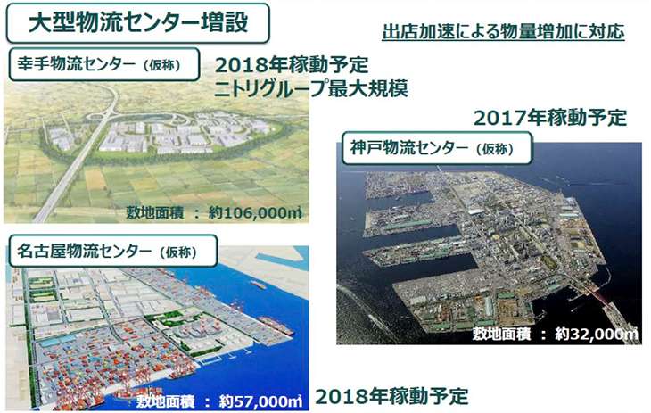 また、2016年度の決算報告資料の物流戦略の項目を見ると大型の3センター稼働について書かれている(図-2)2017年稼働予定の神戸物流センター(敷地面積:約32,000平米)、2018年稼働予定は、幸手物流センター(敷地面積:約106,000平米)、名古屋物流センター(敷地面積:約57,000平米)である。