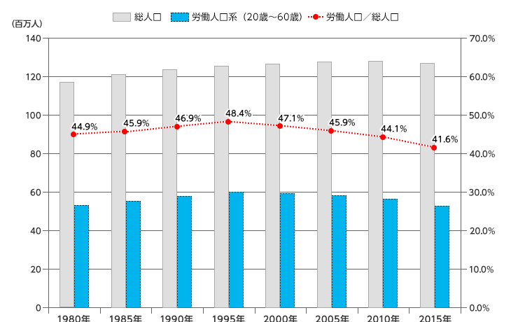 毎日のように、いろいろな場面で「人手不足」という表現を見聞きする。確かに図‐1が示すように労働人口(20歳から64歳として)は総人口の40%となっている。