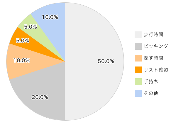 例えば、図‐2を參照して頂きたい。物流センターでの「ピッキング作業」の人時構成を示したものである。ここで50%の人時を費やしている歩行時間は、コンベアやピッキンロボットに置き換えることはできないのか?また、手待ち、リスト確認、探す時間を情報システムや人工知能の活用で削減することはできないのか?