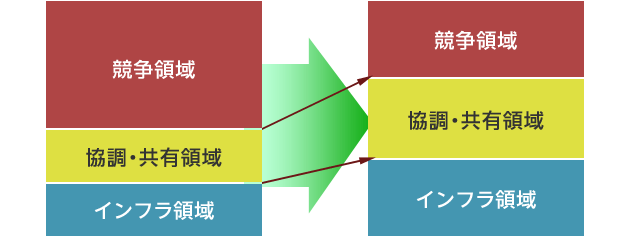私たちがビジネスを行う領域として、私が勝手に呼んでいますが、競爭領域、協調?共有領域、インフラ領域と3つの領域があります。インフラ領域というのは國や自治體や業界団體が整備するものです。國、自治體、業界団體が提供してくれるものととらえてもよいでしょう。