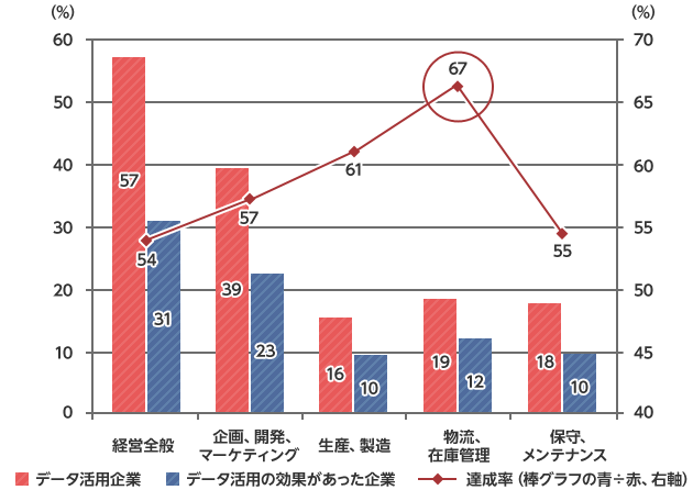 見ていただくとわかるように、物流在庫管理の棒グラフが低くなっています。その一方で、データを活用したときの効果という意味では一番高い數字が出ています。