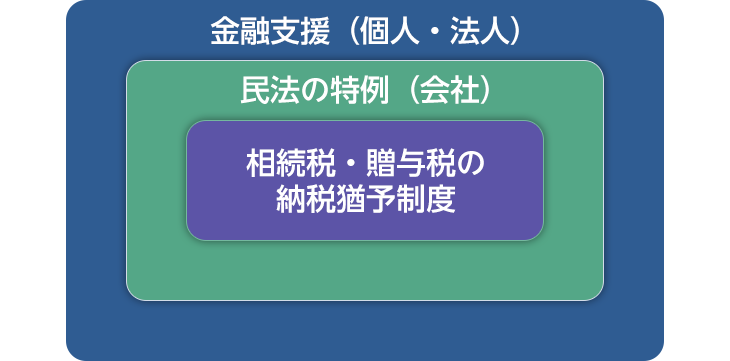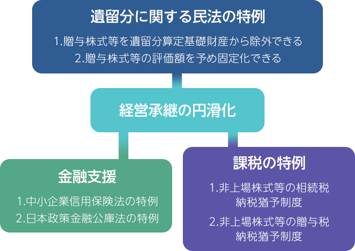 この中小企業経営承継円滑化法では、事業承継をスムーズに行えるよう三つの支援措置「遺留分に関する民法の特例、金融支援措置、課稅の特例」を盛り込んでいます。