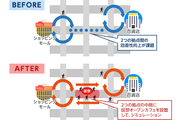 「スマート?プランニング実踐の手引き(案)」では、いくつかの事例が紹介されています。まず、ひとつの事例として、新しいショッピングセンターと古くからある百貨店という、2つの拠點を結ぶ通りの魅力を高め、回遊性を向上させたいという課題がある場合、下図のように、2つの拠點の中間地點に「仮想のオープンカフェ」を設置。収集したデータを活用して人の回遊や活用狀況のシミュレーションを行うことで、このような施設が有効かどうかを確認することができるわけです。