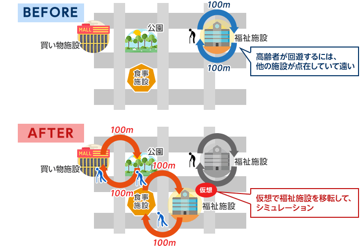 また、福祉施設の最適な配置シミュレーションを行いたい場合、仮に歩いていける距離に設置し、高齢者がどのように動くことが可能なのかをシミュレーションしてみるといったプランニングが可能になります。