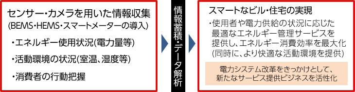 具體的には、ビル?家庭において、エネルギー使用狀況、活動(dòng)環(huán)境の狀況、消費(fèi)者の行動(dòng)把握など、センサー?カメラを用いた情報(bào)収取(BEMS?HEMS?スマートメータの導(dǎo)入)を行い、その情報(bào)を活用することで、使用者や電力供給の狀況に応じた最適なエネルギー管理サービスを提供し、エネルギー消費(fèi)効率を最大化(同時(shí)により快適な活動(dòng)環(huán)境を提供)するスマートなビル?住宅の実現(xiàn)を目指すというものです。さらに、「電力システム改革をきっかけとして、新たなサービス提供ビジネスを活性化していく」とし、建築物については、2030年までに新築建築物の平均でZEB(ネット?ゼロ?エネルギー?ビル)を?qū)g現(xiàn)することを目指すとしています。