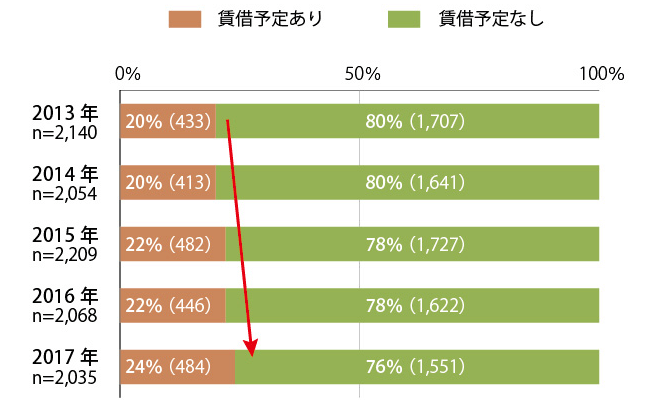 また、企業がオフィスを新規賃借する予定についての調査では、24%の企業が「新規賃借の予定がある」としており、2013年以降、年々増加傾向となっています。そして、新規賃借意向のある企業の約6割がオフィス面積の拡大を予定しており、新規賃借理由の上位が「業容?人員拡大」「立地の良いビルに移りたい」「フロア面積が大きなビルに移りたい」という結果になっているようです(森ビル「東京23區の大規模オフィスビル市場動向調査2018」より)。