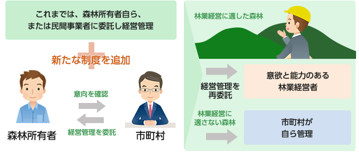 所有者を特定する林地臺帳を策定するとはいうものの、これまで何十年も放置されてきた森林の持ち主が突如現れるとは思えません。また、たとえ所有者が確定しても、その人たちが森林管理を受け継ぐとは限りません。相続されて森林から遠く離れた地域に住んでいるかもしれませんし、近くに住んでいても林業に従事する意思がないかもしれません。そこで國は、市町村を仲介役とする新しい森林管理制度を法制化することにしました。それが19年4月に施行される森林経営管理法です。
