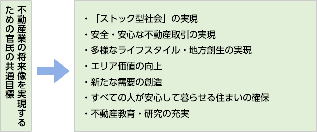 「ビジョン」では、不動産業が今後実現すべき官民の共通目標を7つ掲げています。人口減少がさらに進み、一方で空き家など遊休の土地が増えることを考えると、今後は「殘された」不動産、つまり不動産ストックの質を高めて、それを最大限利活用する仕組みを作ることが求められます。これは人口増加局面で策定された過去2度のビジョンにはない、新たな目標です。