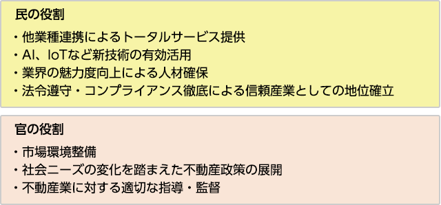 ビジョンは、民間と國の役割について、その前提として業界が「信頼産業」として認知されるようコンプライアンスの徹底を掲げています。近年、賃貸住宅投資や原野商法など不動産を巡るトラブルが発生しており、一部悪質な不動産業者が存在しています。基幹産業である不動産業が國民に愛される業界であり続けるには、法令順守や業務遂行における透明性の確保が不可欠と強調しています。 そのうえで、民間の不動産業関係者は従來の伝統的、畫一的手法にとらわれることなく、多様なニーズに合わせて他業種や行政との連攜や協働を通じたトータルサービスを提供するよう述べています。また、AIやIoTなどの新技術を効果的に活用し、業務の効率化を図ること。人材確保のために、業界全體で定著率を高める職場環境の整備など擔い手問題を改善することを指摘しています。