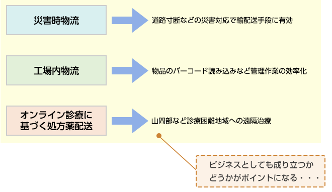 検討會(huì)における議論で現(xiàn)在ドローンの活用について具體案が検討されています。第2回の議事概要で、(1)災(zāi)害時(shí)物流(2)工場(chǎng)內(nèi)物流(3)オンライン診療に基づく処方薬配送の3つを検討していることが明らかになっています。