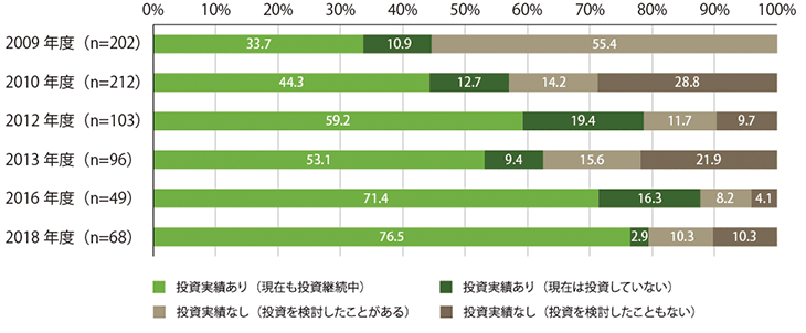 「投資実績あり(現在も投資継続中)」の割合は、2009年度調査では33.7%、2010年度で44.3%、2012年度59.2%、2013年度53.1%、2016年度71.4%でしたが、2018年度は76.5%となっています。2013年を除けば、年を追うごとに、「日本に不動産投資を行っている」とする投資家が増加しています。
