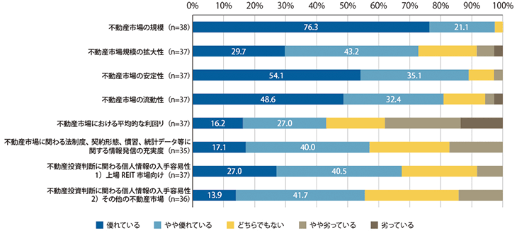 「不動産市場の規模」については、76.3%の投資家が「優れている」としており、「不動産市場の安定性」についても54.1%、「不動産市場の流動性」については48.6%、「不動産市場規模の拡大性」については29.7%の投資家が、「優れている」と評価しています。