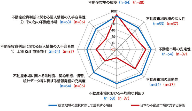 図3:投資地域の選択に際して重視する項目と日本の不動産市場に対する現狀評価のDI比較