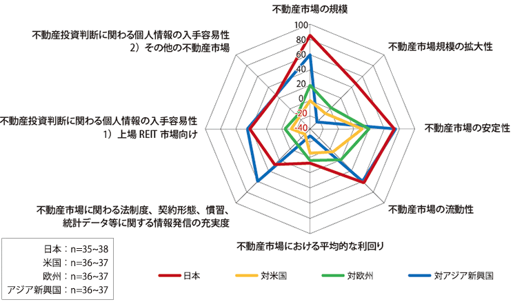 「不動産市場の規模」、「不動産市場の安定性」はアジア新興國と比較すると優位であるとの評価が高く、また、日本と同様に先進國である米國?歐州と比較しても同等もしくはやや優位との評価がなされています。同時に、この「安定性」への評価は、「利回り」の評価の低さとなっているともいえます。
