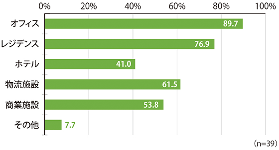 不動産投資における用途を見てみると、2018年の數値は「オフィス」が89.7%と最も多く、次いで、「レジデンス」(76.9%)、「物流施設」(61.5%)、「商業施設」(53.8%)、「ホテル」(41.0%)の順となっています。今回の調査から、「物流施設」が「商業施設」を上回り、「ホテル」も40%を超えるなど、昨今の投資のトレンドが表れた結果となっています。