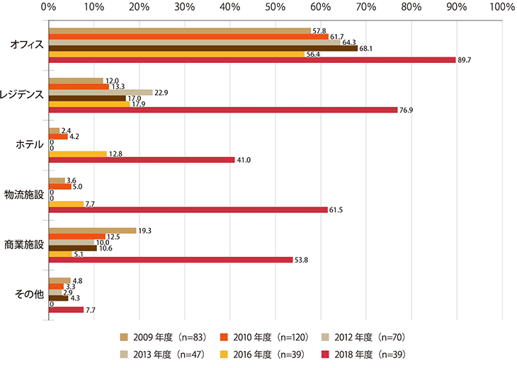今年度の調査から、「代表的なものを1つ」ではなく、「複數回答可」になっているため、単純な比較はできませんが、2013年度と2016年度との比較から、2018年度の數値を見ると、やはり、ホテル、物流施設の延びが顕著であるといえるでしょう。