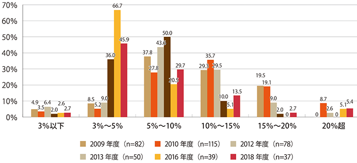 2016年度の調査では、「3%超~5%以下」に集中していましたが、今回は、少し分散した結果となりました。2016年度調査に比べると、目標利回りは上昇していますが、2009年度調査からの傾向を見てみると、低下傾向であることは間違いないでしょう。
