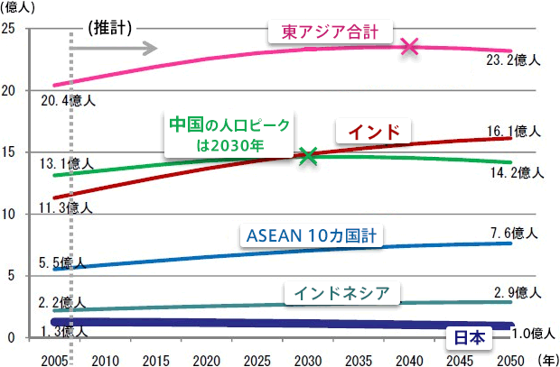 一方、國土交通省の資料によれば、世界全體の人口は2050年まで一貫して増加傾向にあり、2005年の約70億人から2050年には約90億人になると予測されています。人口シェアでみるとアジアが過半を占めますが、その大半はいうまでもなく人口では超大國の中國とインド。東アジア全體では、2040年までに人口は約3億人増加しますが、その後は減少に転じます。中國は1979年から続けてきた「一人っ子政策」を2015年に緩和しましたが、人口は2030年頃をピークに減少すると見込まれています。